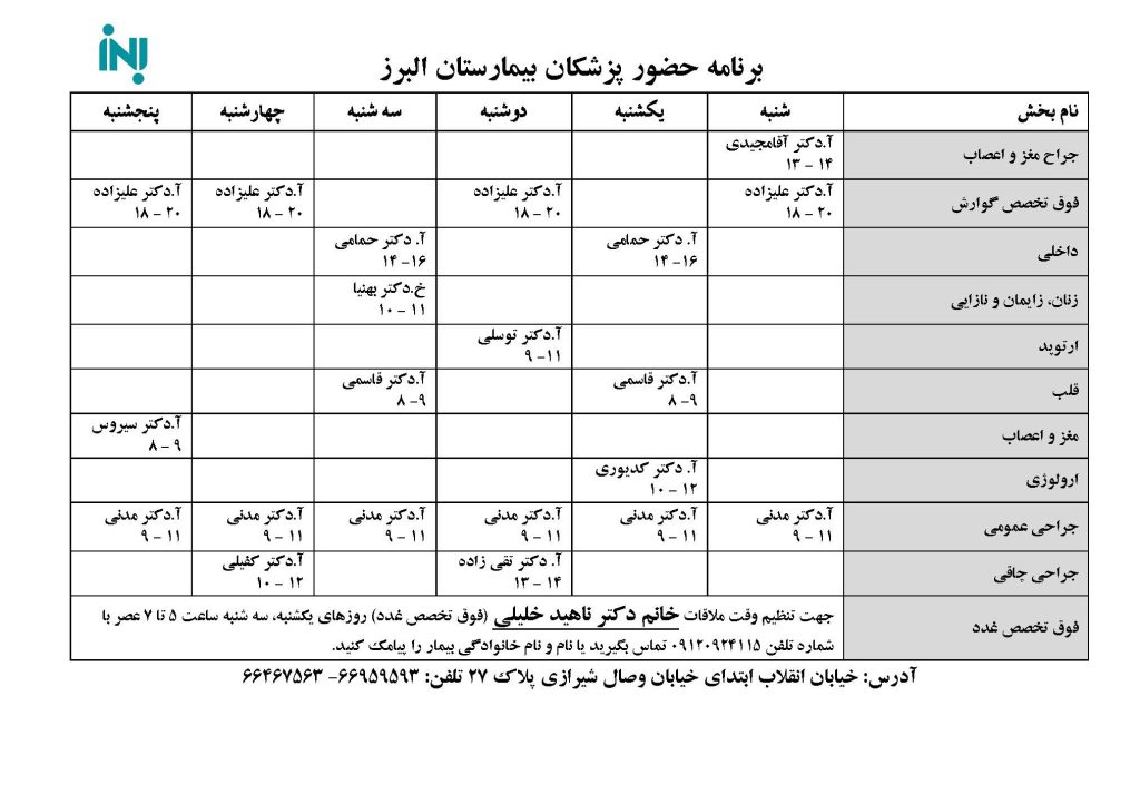 دكتر مسعود توسلی متخصص جراحی استخوان و مفاصل (ارتوپدی) نوبت دهی دکتر علی اصغر کدیوری متخصص جراح کلیه و مجاری ادراری(اورولوژی) نوبت دهی دکتر نیما تقی زاده متخصص جراحی عمومی و جراحی لاپاروسکوپی و چاقی نوبت دهی دکتر سید مسیح سید مدنی متخصص جراح عمومی نوبت دهی دکتر امیرحسین گل محمدی متخصص جراحی عمومی نوبت دهی دکتر یونس حمامی متخصص داخلی گوارش و ریه نوبت دهی